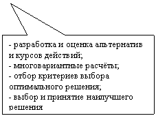 На стадии принятия решения осуществляются разработка и оценка альтернативных решений и курсов действий, проводимых на основе многовариантных расчётов; отбор критериев выбора оптимального решения; выбор и принятие наилучшего решения.