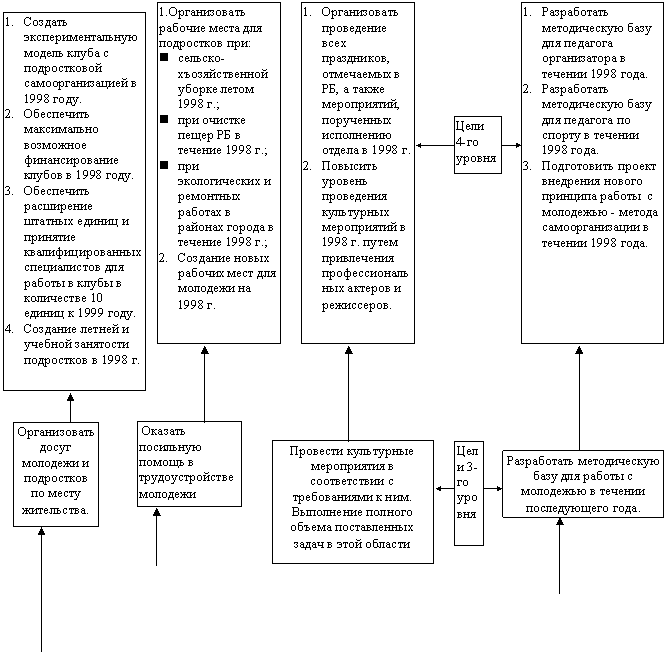 1. Создать экспериментальную модель клуба с подростковой самоорганизацией в 1998 году. 2. Обеспечить максимально возможное финансирование клубов в 1998 году. 3. Обеспечить расширение штатных единиц и принятие квалифицированных специалистов для работы в клубы в количестве 10 единиц к 1999 году. 4. Создание летней и учебной занятости подростков в 1998 г. 5. Организовать рабочие места для подростков при: n сельско-хозяйственной уборке летом 1998 г.; n при очистке пещер РБ в течение 1998 г.; n при экологических и ремонтных работах в районах города в течение 1998 г.; 6. Создание новых рабочих мест для молодежи на 1998 г. 7. Организовать проведение всех праздников, отмечаемых в РБ, а также мероприятий, порученных исполнению отдела в 1998г 8. Повысить уровень проведения культурных мероприятий в 1998 г. путем привлечения профессиональных актеров и режиссеров. 9. Разработать методическую базу для педагога организатора в течении 1998 года. 10. Разработать методическую базу для педагога по спорту в течении 1998 года. 11. Подготовить проект внедрения нового принципа работы с молодежью - метода самоорганизации в течении 1998 года. |