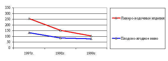 В дальнейшем мы не будем рассматривать виноградные и игристые вина, т.к. их доля в общем объеме весьма не значительна так в 99 доля виноградного вина – 6,5%, а игристого – 1,3% от общего объема вина