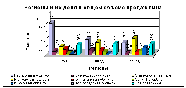 Как видно из приведенных выше данных, республика Адыгея является основным потребителем продукции предприятия (64,1% - 97год, 51,2% – 98 год, 30,4% – 99год от общей реализации ликеро-водочной продукции, 52,2% - 97год, 30,1% – 98 год, 21,1% – 99год от общей реализации вина плодово-ягодного).