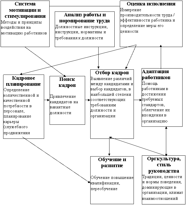 На схеме 1 представлены связи между процессами поиска и отбора персонала и основными направлениями кадровой работы организации.