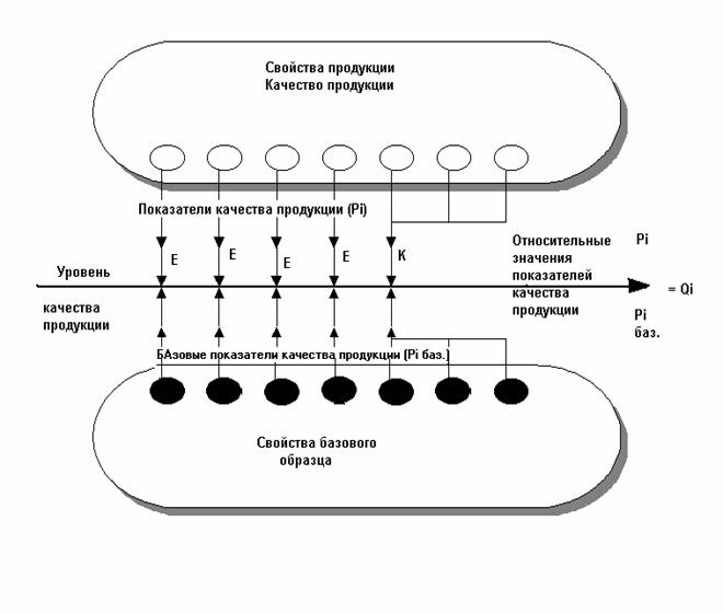 Схема 1.3. Оценка уровня качества продукции: Е – единичные показатели качества; К – комплексный показатель качества.