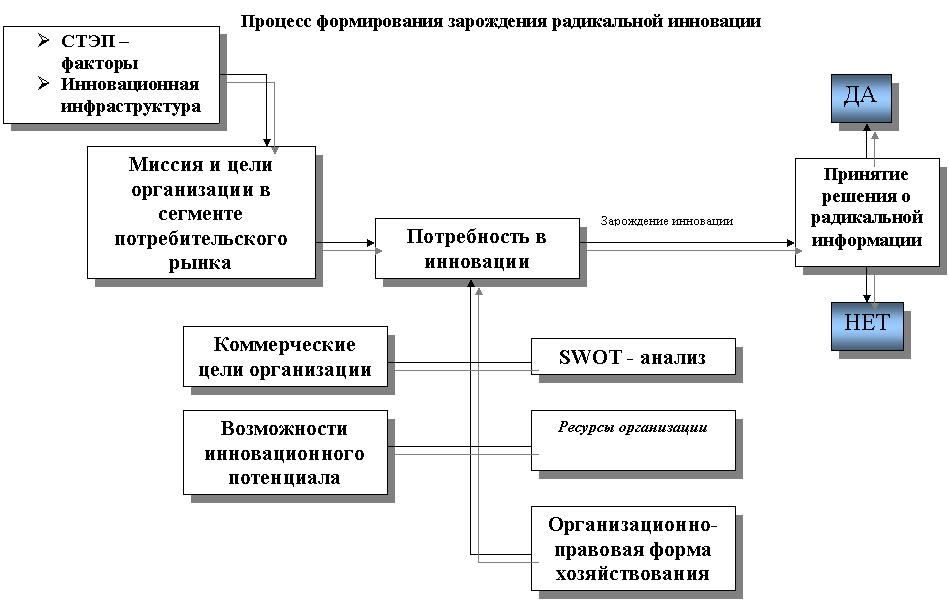 Для повышения эффективности деятельности торговой организации ей необходима разработка и введение в действие инновации, применение которой обеспечило бы улучшение результатов его работы. На процесс формирования зарождения радикальной инновации влияет множество факторов. В первую очередь - это СТЭП – факторы и инновационная структура, именно с них начинается процесс формирования. После проведения предварительного анализа влияния окружающих факторов на инновацию, необходимо рассмотреть миссии и цели организации в сегменте потребительского рынка, и только затем перейти к оценке потребности в инновации.