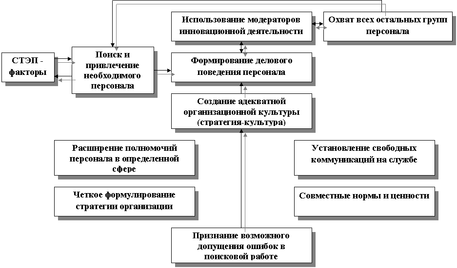 - зарождение нововведения сопровождаемое влиянием инновационной инфраструктуры организации и готовностью персонала к выполнению инновационной стратегии