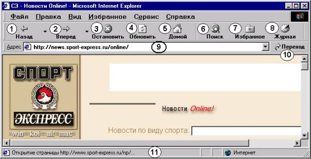 10 – кнопка Переход, предназначена для перехода к Web-странице по адресу, введенному в адресную строку.