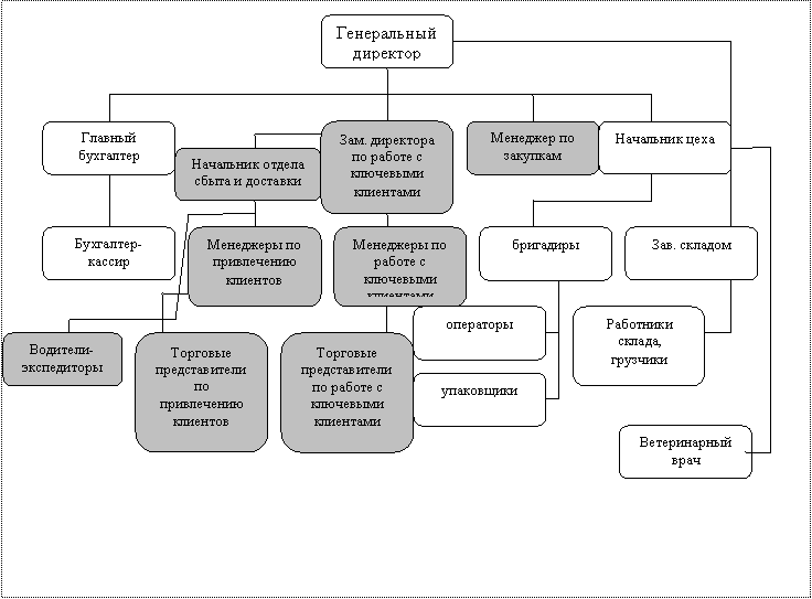 Итак, новую организационную структуру можно увидеть на рис. 2. Серым цветом выделены члены, организованные в команду. Начальник отдела сбыта и снабжения будет контролировать процесс доставки товара и работать целенаправленно на привлечение новых клиентов, Заместитель директора по сбыту займётся непосредственно имеющейся клиентской базой. Считаю такой вариант наиболее рациональным, т. к. сотрудники из фирмы не уходят, у многих из них появляется материальная заинтересованность, чем им так не хватало (см. результаты опроса посредством анкеты), а так же налицо карьерный рост.