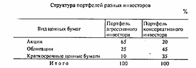 3. Определить первоначальный состав портфеля. В зависимости от инвестиционных целей вкладчика возможно формирование портфеля, предлагающего больший или меньший риск. Исходя из этого инвестор может быть агрессивным или консервативным. Агрессивный инвестор - инвестор, склонный к высокой степени риска инвестиционной деятельности он делает акцент на приобретение акций. Консервативный инвестор - инвестор, склонный к меньшей степени риска. Он приобретает в основном облигации и краткосрочные ценные бумаги. (Структура портфелей разных инвесторов показана в табл. 1.)