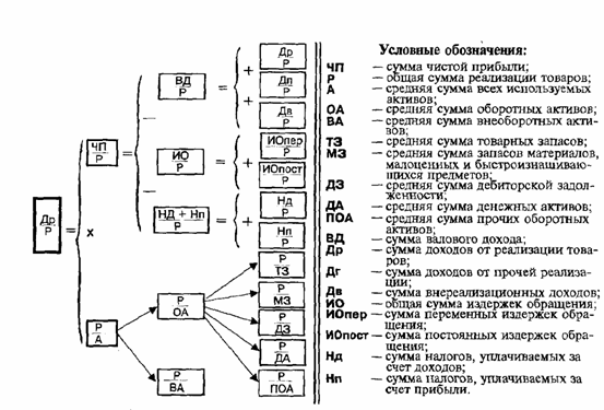 В соответствии с этой моделью коэффициент рентабельности всех используемых активов торгового предприятия определяется произведением коэффициента рентабельности реализации товаров на коэффициент оборачиваемости всех используемых активов: