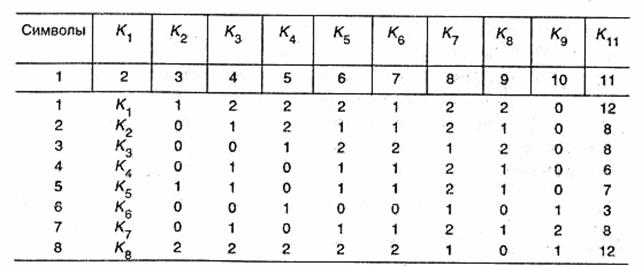 При сравнении К1 и К2, например, выявлено, что символ К1 предпочтительнее символа К2. Тогда в четвертый столбец первой строки матрицы записывают 2 и по аналогии, поскольку символ К2 менее значим, чем К1, в третий столбец второй строки – 0. К1 по значимости равен K5, так как в седьмом столбце первой строки записано 1.