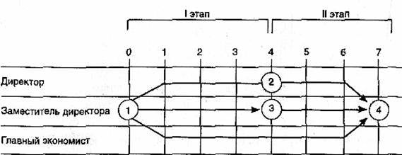 Из рис. 3.8 видно, что работы 1–2 и 2–4 выполняются директором, работы 1–3 и 3–4 – заместителем директора, работы 1–4 – главным экономистом. Работы 1–2 и 1–3 выполняются на этапе 1 решения; работы 2–4 и 3–4 – на этапе II, а работы 1–4 – в течение этапов 1 и If.