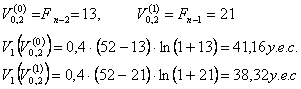 у.е.ст. Для вычисления точного значения воспользуемся методом “фиктивных” точек. Сформируем последовательность F0=F1=1, F2=2, F3=3, F4=3+2=5, F5=5+3=8, F6=8+5=13, F7=13+8=21, F8=34. Отсюда определяем n = 8. Для удобства дальнейших вычислений сформированную последовательность запишем следующим образом Fn=34, Fn-1=21, Fn-2=13, Fn-3=8, Fn-4=5, Fn-5=3, Fn-6=2, Fn-7=1. Вычислим значение целевой функции в точках