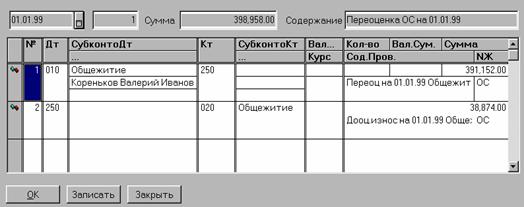При проведении документа будут сформированы проводки по каждому основному средству, учитываемому на отобранных в спецификацию счетах: Дт01, Кт250 - на сумму дооценки стоимости; Дт250, Кт020 - на сумму дооценки износа. Кроме того, при проведении документа в карточке ОС заполняются реквизиты группы «Переоценка».
