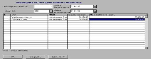 Документ «Переоценка ОС методом прямого пересчета»