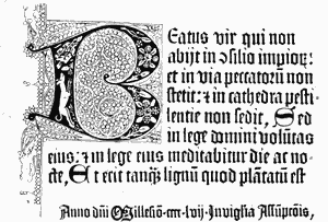 "Настоящее собрание псалмов, - украшенное красивыми заглавными буквами и достаточно разделенное рубриками, - благодаря искусному открытию печатания без помощи пера, изготовлено к прославлению Бога после многих трудов и забот и выпущено для пользования Иоганном Фустом, майнцским горожанином, и Петром Шеффером из Гернсгейма в год Господень 1457, в канун Успения Божией Матери".