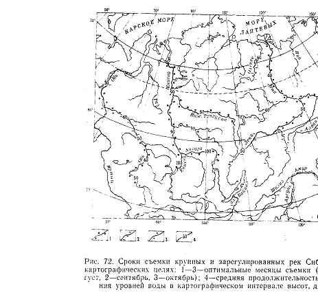 Для определения этих параметров на опорных гидрологических створах рек Сибири вычислены: картографический уровень воды; картографический интервал уровней воды; средняя годовая повторяемость уровней воды в картографическом интервале высот. Далее, по данным стандартных гидрологических наблюдений Гидрометеослужбы, установлено наилучшее время дистанционной съемки, т. е. месяцы, в которые наблюдалась наибольшая повторяемость уровней воды в оптимальной шкале высот. По полученным материалам построены карты наилучших сроков аэрокосмической съемки рек в картографических целях (рис. 71, 72). При этом выявлено, что продолжительность стояния уровней воды в картографическом интервале высот изменяется зонально и по высотным поясам, т. е. отражает общие географические закономерности гидрологического режима рек. Так, в пределах Среднесибирского плоскогорья на широте 55—60" этот параметр для рек местного стока равен приблизительно 100 дней, на широте 70°— 30 дней. В горах с увеличением высоты он уменьшается. Например, в северных предгорьях Саян он находится в пределах 80—90 дней, а в верхнем поясе гор сокращается до 30 дней в году.