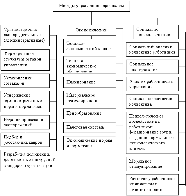 Методами управления персоналом называют способы воздействия на коллективы и отдельных работников с целью осуществления координации их деятельности в процессе производства. Все методы делятся на три группы: административные, экономические и социально-психологические (рис. 3).