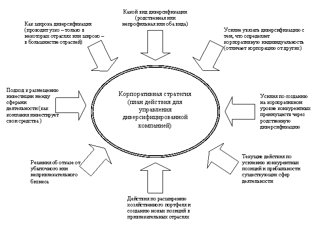 Корпоративная стратегия состоит в том , как диверсифицированная компания утверждает свои деловые принципы в различных отраслях, а так же действиях и подходах, направленных на улучшение деятельности групп предприятий, в которые диверсифицировалась компания.