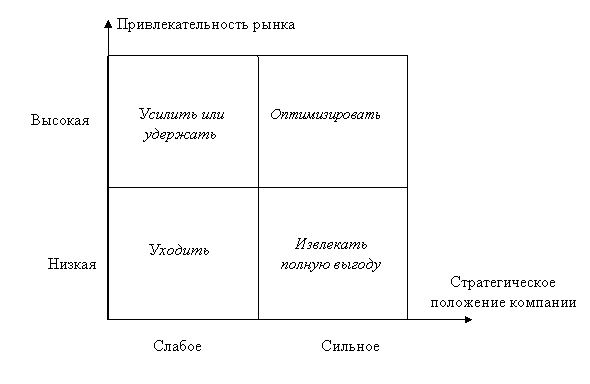 Эта матрица позволяет принимать дифференцированные стратегические решения по эффективному использованию потенциала компании в зависимости от различного уровня привлекательности рынка.