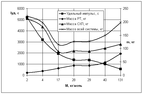 Из анализа этого графика следует, что по критерию минимальной массы системы хранения и рабочего тела наилучшим рабочим телом является аммиак. Однако следует принять во внимание тот факт, что в случае применения в качестве СХП водорода такой системы хранения как, например, хранение водорода в металлогидридах или в связанном состоянии, суммарная масса такой СХП рабочего тела водорода может быть снижена и станет ниже массы газобаллонной СХП других рабочих тел. Необходимо учитывать тот факт, что в отличие от аммиака, который является химически активным и, соответственно, требует для своих СХП использования дорогих конструкционных материалов и систем предотвращения утечки, и имеет достаточно низкий удельный импульс, не токсичный и не химически активный водород позволяет упростить структуру СХП.