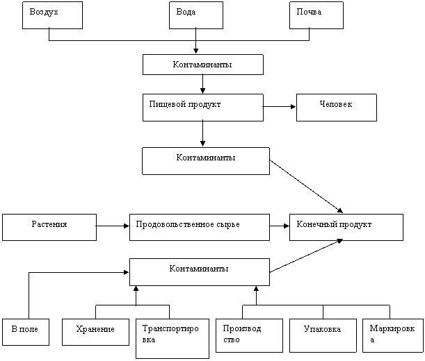 Потенциально опасные для здоровья человека химические и биологические вещества попадают и накапливаются в пищевых продуктах по ходу как биологической цепи (обеспечивающей обмен веществ между живыми организмами, с одной стороны, и воздухом, водой и почвой – с другой), так и пищевой цепи, включающей все этапы сельскохозяйственного производства продовольственного сырья и пищевых продуктов, а также хранение, упаковку и маркировку, что отражено на рисунке 1. Конкретные источники загрязнений пищевых продуктов приведены в таблице.