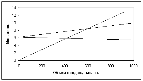 Независимо от объема сбыта постоянные издержки равняются 6 млн. долл. Валовые издержки (сумма постоянных и переменных издержек) растут одновременно с ростом сбыта. Кривая валовых поступлений начинается с нулевой отметки и поднимается вверх по мере увеличения числа проданных единиц товара. Крутизна наклона кривой валовых поступлений зависит от цены товара.[5]