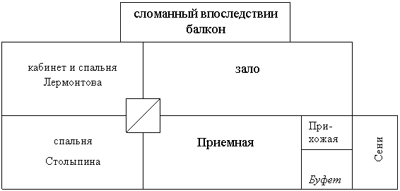 Собственно, у каждого было по одной комнате – спальне, так как одна из комнат на лермонтовской половине служила общей столовой или, как тогда называли комнаты для приема гостей, – залом, где собирались все приходившие к Лермонтову товарищи. Вторая – столыпинская – называлась приемной, но никаких приемов в ней не производилось. Там большей частью находились слуги. От этой приемной была отделена легкой перегородкой буфетная и прихожая. Кухня находилась в подвальном помещении. Кушанья подавались в буфет через маленькое оконце, нижняя часть которого приподнималась.