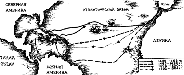 Маршруты экспедиций Колумба Так или иначе, но из колоний поступало незначительное количество золота, меди и других товаров. Королевский доход от Эспаньолы был значительно меньше расходов на экспедиции. Престиж Колумба в Испании упал, и в 1495 году был издан указ, разрешающий всем желающим переселяться на новые земли, если они будут вносить в королевскую казну две трети добытого золота. Также дозволялось любому предпринимателю снаряжать корабли на запад для открытия новых земель и добычи золота. Встревоженный Колумб отправился в Испанию защищать свои права, 11 июня 1496 года в бухте Кадис ошвартовались его каравеллы "Нинья" и "Индия". Королевский двор, прослышав, что король Португалии снаряжает новую экспедицию в Индию, дали согласие Колумбу на третью экспедицию. Целью ее стали доставка продовольствия и товаров в Эспаньолу и поиски материковой Индии южнее Эспаньолы, где Колумб надеялся обнаружить драгоценные камни, золото и давно искомые пряности. "Нинья" и "Индия" вышли в плавание в январе 1498 года. Кроме них, были зафрахтованы еще шесть каравелл. Три из них под командованием Алонсо де Карвахаль должны были доставить на Эспаньолу продукты и грузы. Три каравеллы - "Ли-Нао", "Ва-кеньос" водоизмещением в 70 тонн и "Коррео" - под командованием Колумба отправились на поиски новых земель. 30 мая 1498 года флотилия Колумба вышла из порта Сан-Лукар к Канарским островам. 1 августа был открыт остров Тринадад (Троица), на западе от острова наконец-то была обнаружена часть южноамериканского материка, названная Колумбом "Земля Грасия" (Благодать). Направляясь дальше на северо-запад, Колумб открыл остров Маргарита (Жемчужный), действительно богатый жемчугом, и 31 августа 1498 года вернулся на Эспаньолу. В 1500 году на Эспаньолу прибыл новый наместник Франсиско Бовадилья, который сместил Колумба, арестовал его и трех его братьев и в кандалах отправил их в Испанию. В конце октября 1500 года корабль "Ла-Горду" доставил узников в гавань Кадис. Только через шесть недель король и королева распорядились снять оковы с Колумба и вызвали ко двору.