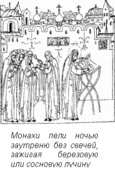 Когда обитель только начала устраиваться и в ней жило немного братьев, когда не было посетителей, приносивших нужное для жизни братии, тогда часто недоставало самых необходимых вещей, так что много раз с утра и хлеба не было. Кто сможет перечислить все лишения, которые перенес преподобный отец наш Сергий? В первое время. когда начиналось устроение обители, порой не было хлеба — ни муки, ни пшеницы, ни какого-либо другого зерна; иногда недоставало масла, соли, съестных припасов; порой не было вина, чтобы служить обедню, и ладана для каждения; иногда не было воска, чтобы катать свечи, и монахи пели ночью заутреню без свечей, зажигая березовую или сосновую лучину, при свете которой они канонаршили или читали по книгам,— так они отправляли всенощные службы. Преподобный же Сергий всякую нужду, беду, скудость и лишения терпел с благодарность ожидая от Бога великой милости.