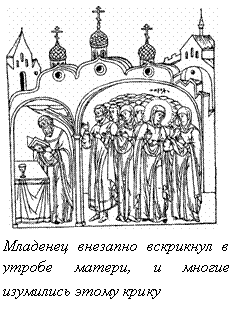 Было же и чудо некое до рождения его: случилось нечто такое, что нельзя предать забвению. Когда ребенок еще был в утробе матери, однажды в воскресенье мать его пришла в церковь, как обычно, ко святой литургии. Она стояла с другими женщинами в притворе, а когда должны были приступить к чтению святого Евангелия и все люди стояли молча, младенец внезапно вскрикнул в утробе матери, так что многие изумились этому крику — преславному чуду, совершившемуся с младенцем. И вот снова, в самом начале Херувимской песни, на словах «Иже херувимы», младенец внезапно начал громко верещать в утробе, еще громче, чем в первый раз, и его голос разносился по всей церкви. Мать его стояла в ужасе, и женщины, бывшие там, недоумевали и говорили: «Что же будет с этим младенцем?» Когда же иерей возгласил: «Вон-мем. Святая святым!», младенец снова, втретийраз, громко закричал.