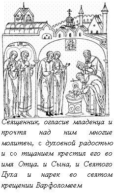 Тут же они повелели священнику совершить над ним Божественное крещение. Священник, огласив младенца и прочтя над ним многие молитвы, с духовной радостью и со тщанием крестил его во имя Отца, и Сына, и Святого Духа и нарек во святом крещении Варфоломеем. Священник вынул ребенка, обильно принявшего от Святого Духа благодать крещения, из купели, и, осененный Божественным Духом, иерей провидел и предузнал, что этот младенец будет сосудом избранным.