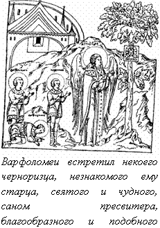 Старец воздел руки, возвел очи к небу, вздохнув пред Богом, усердно помолился и после молитвы сказал: «Аминь». Бережно достав из кармана, он, как некое сокровище, тремя пальцами подал Варфоломею нечто похожее на анафору 27, с виду маленький кусок белого пшеничного хлеба — святой просфоры, и сказал ему: «Открой уста свои, чадо, возьми это и съешь — это тебе дается в знамение благодати Бо-жией и понимания Священного Писания. Хотя и маленькой кажется частица, которую я даю тебе, но велика сладость вкушения от нее». Отрок открыл уста и съел то, что ему было дано, и была сладость во рту его. как от сладчайшего меда. И он произнес: «Не об этом ли сказано: Как сладки гортани моей слова Твои! Лучше меда устам моим [Пс. 118. 103], и душа моя весьма возлюбила их». Старец ответил ему: «Если веруешь, больше этого увидишь. А о грамоте, чадо, не скорби: знай, что отныне Господь дарует тебе хорошее знание грамоты, большее, чем у твоих братьев и сверстников» — и поучил его на пользу души.