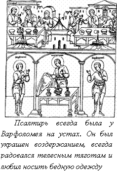 Варфоломей вернулся в свой дом, радуясь душой и сердцем, как будто бы он приобрел некое бесценное сокровище, обильное духовное богатство, ибо преподобный юноша очень хотел начать монашескую деизнь. Вернувшись домой после смерти родителей, он начал расставаться с житейскими заботами. На дом и на все вещи, необходимые в доме. он смотрел с презрением, вспоминая в сердце своем Писание, в котором сказано, что мирская жизнь полна многих вздохов и печалей. Пророк сказал: Покиньте их, и отделитесь от них, и нечистого не касайтесь [2 Кор. 6-17]. Вот слова другого пророка: покиньте землю и взойдете на небо. И Давид сказал: Прилепьигась душа моя к Тебе; меня поддерживает десница Твоя [Пс. 62. 9], и еще: Далеко удалился бы я и оставался бы в пустыне, надеясь на Бога. спасающего меня [Пс. 54. 8]. И Господь в Евангелии сказал: Если кто приходит ко Мне и не отречется от всего, что имеет, тот не может быть Моим учеником [Лк- 14. 26, 33]. Укрепив этими словами душу и тело, он позвал Петра, своего младшего брата, и оставил ему отцовское наследство и все, что было в родительском доме, потребное для жизни. Сам он не взял себе ничего, следуя словам Божественного апостола, сказавшего: Я все почитаю за сор, чтобы приобрести Христа [Фил. 3. 8].