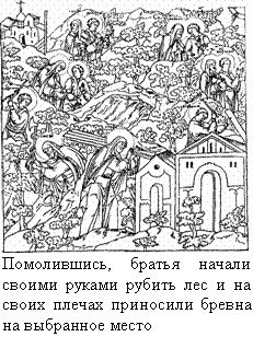 Они исходили много лесов и наконец пришли в одно пустынное место в чаще леса, где был источник воды. Братья обошли то место и полюбили его, ибо Бог направлял их. Помолившись, они начали своими руками рубить лес и на своих плечах приносили бревна на выбранное место. Сначала братья сделали себе хижину для ночлега с чуланом и устроили над ней крышу, потом построили келью, огородили место для небольшой церковки и срубили ее- Когда была завершена постройка церкви и пришло время освящать ее, блаженный юноша сказал Стефану: «Поскольку ты мой старший брат по рождению и по плоти, но более по духу, мне следует слушаться тебя как отца. Сейчас мне не с кем советоваться обо всем, кроме тебя. Усердно молю тебя ответить