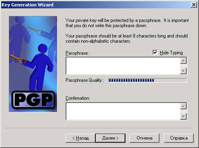 8. Введите ключевую фразу (Passphrase) – комбинацию букв и цифр. Обратите внимание на регистр (клавиша CapsLock) и язык – русский или английский.