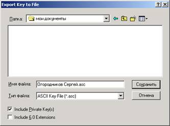 Выберите папку для ключа, например, «Мои документы» (включите Include Private Keys)