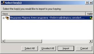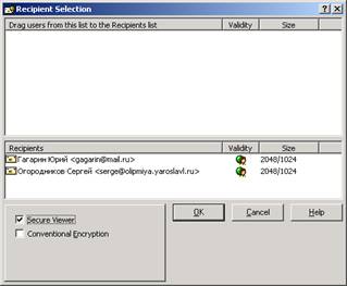 2. В открывшемся окне перенесите Ключ (открытый) человека, кому Вы хотите отправить письмо в список получателей, а также свой ключ! И нажмите ОК