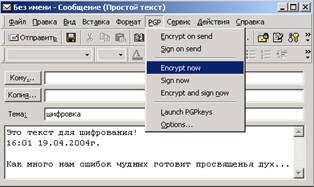1. Для шифрования письма – при его создании в главном меню «PGP» Выберите «Encrypt now» (Зашифровать сейчас) как показано на рисунке