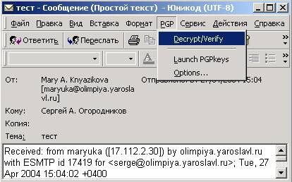 4. При получении зашифрованного письма, откройте его и в меню «PGP» выберите пункт «Decript/Verify» (Расшифровать/Проверить).
