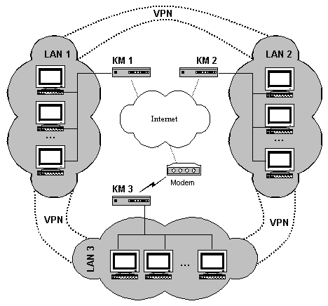 Типичная схема подключения локальной компьютерной сети к глобальной сети (Internet) с использованием криптографического маршрутизатора (КМ) КРИПТОН-IP (Рис. 6.5.1.).