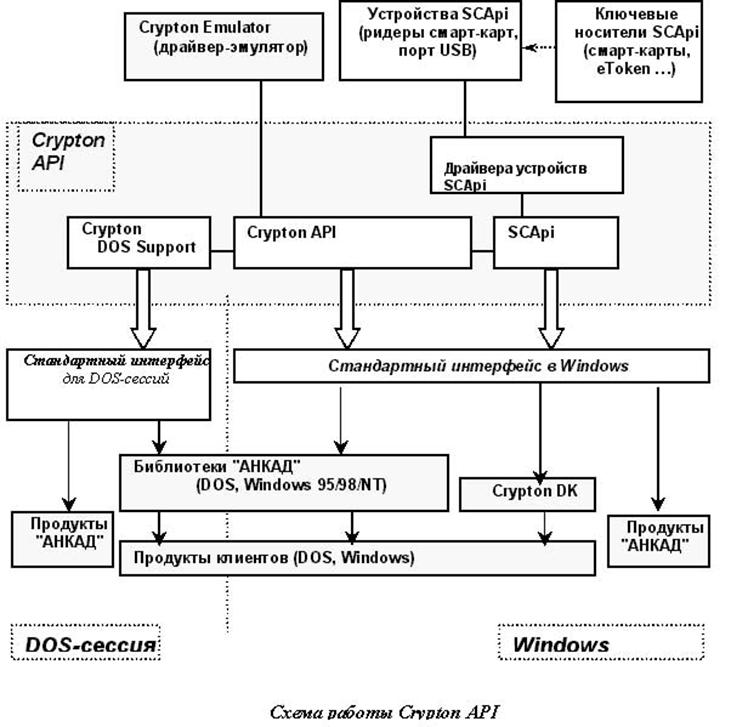 Универсальность интерфейса, предоставляемого пакетом программ Crypton API, состоит в том, что предоставляемый программам интерфейс идентичен независимо от конкретного УКЗД серии "Криптон" (или даже его программного эмулятора) и независимо от типа ключевого носителя, подключаемого через интерфейс SCApi. Эмулятор подключается к Crypton API аналогично драйверу УКЗД серии "Криптон". Схема работы Cripton API представлена Рис. 6.5.2.