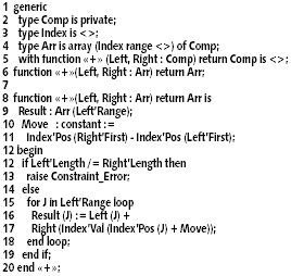 В теле функции мы первым делом проверяем, совпадают ли длины операндов (строка 12), иначе покомпонентное сложение не имеет смысла. Совпадение длин операндов не гарантирует совпадение индексных диапазонов, поэтому в цикле по индексному диапазону первого аргумента (строка 15) нам необходимо каждый раз вычислять индекс соответствующего компонента второго аргумента. Мы лишены возможности сделать это для типа Index, так как знаем про него только, что он дискретен, поэтому переходим от значения дискретного типа к его порядковому номеру (атрибут ‘Pos), вычисляем необходимый сдвиг для порядкового номера и возвращаемся к соответствующему значению типа Index (атрибут ‘Val).