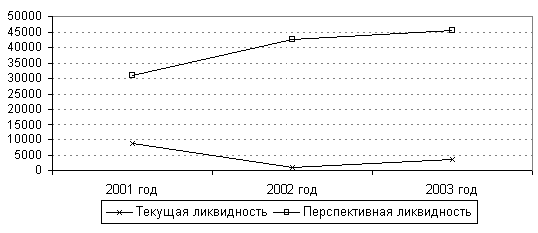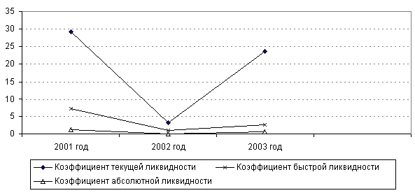 В период с 2001 года по 2003 год коэффициент текущей ликвидности имел тенденцию к снижению с 29,28 до 23,71. Способность предприятия рассчитываться по своим текущим обязательствам за этот период несколько снизилась. В 2002 году этот коэффициент резко упал с 29,28 до 3,19 (хотя и не ниже рекомендуемого значения), что связано с резким ростом заемного капитала в 2002 году. Но за отчетный год снова вырос до 23,71.