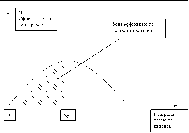 Эффективность работы консультанта равна 0, если клиент в ней не участвует. При росте вовлеченности клиента эффективность растет до точки оптимума (topt), после которой начинает падать, что означает: клиент начинает выполнять за консультанта его работу.