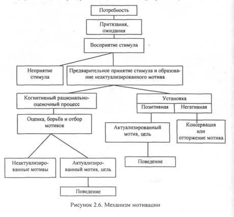 Второй, более длительный цикл механизма мотивации имеет место тогда, когда работник сталкивается с новой ситуацией, относительно которой у него отсутствуют установки, связывающие потребности, стимулы и пути их достижения. В этом случае в механизм мотивации включается такое достаточно сложное звено, как когнитивный, рационально-оценочный процесс. Он представляет собой анализ содержащейся в стимуле информации, соотнесение ее с ценностями личности, ситуацией, возможностями и издержками, которые могут появиться в процессе достижения стимула, значимостью других мотивов (если они существуют). На этой стадии происходит борьба мотивов и выносится вердикт об актуализации мотива, его консервации или отторжении. (Аналогичные функции при более коротком варианте функционирования механизма мотивации выполняет установка.) Актуализированный мотив служит движущей силой, непосредственно причиной поведения, он, собственно, и завершает общий цикл механизма мотивации.