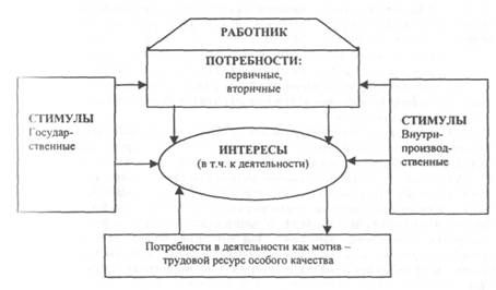 Эта схема показывает, что стимулирование на всех его уровнях может действовать одновременно на все потребности и интересы (в том числе к деятельности). Сама же потребность в деятельности, как потребность внутренняя, глубоко осознанная, как мотив, - формируется на уровне индивида. Если она есть, перед нами трудовой ресурс особого качества, который будет иметь более высокую пену на рынке труда. Наличие такого ресурса на рынке еще не означает его реализацию на уровне отдельных фирм: для этого и необходим внутрифирменный механизм мотивации труда, во взаимодействии звеньев которого рождается потребность в труде (деятельности) именно в данной фирме.