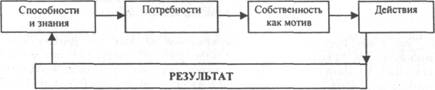 В схеме представлена роль одного из ведущих звеньев - собственности, которая сама по себе выступает как мотив, направленный на осуществление действий по ее сохранению, использованию и развитию. Эти действия порождают результат хозяйствования субъекта. Он может быть положительным (или отрицательным), но в любом случае, он умножает знания и способности индивида, дает ему возможность накопить опыт и адаптироваться во внешней среде.