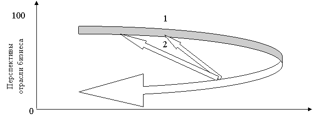 В первом случае (рис.20, направление 1) оптимальной считается траектория развития позиций компании: от позиции «удвоение объема или свертывать бизнес» через позиции «усиление конкурентных преимуществ», «лидера вида бизнеса», «роста», «генератора денежной наличности», «частичного свертывания бизнеса» к позиции «свертывания».