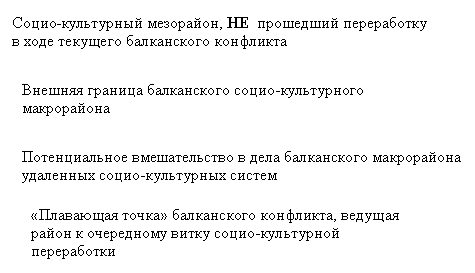 Не станем детально описывать модель. Значительная часть материала по балканским конфликтам дана в "Балканском измерении пространства и времени". Социо-культурные процессы в целом детально описаны в ряде наших монографий, неоднократно указанных в примечаниях.
