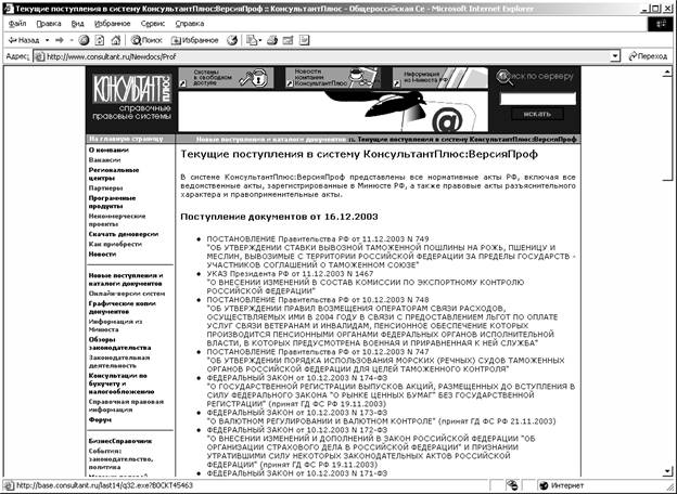 Эти две системы принципиальных функциональных различий не имеют. Главная страница базы «Версия Проф» Интернет-сайта «Консультанта-плюс» изображена на рис. 21. Думаю, пользователи выбирают одну из этих систем, руководствуясь чисто эстетическими предпочтениями. Ведь они имеют разные интерфейсы; разное оформление.