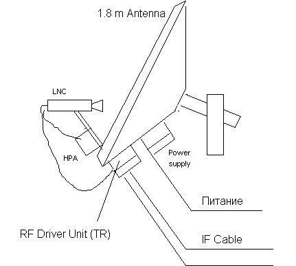 Приемопередающий блок обеспечивает преобразование низкочастотного сигнала, его усиление и передачу “вверх”, а также прием высокочастотного сигнала со спутника его преобразование в низкочастотный и передачу к внутреннему блоку.